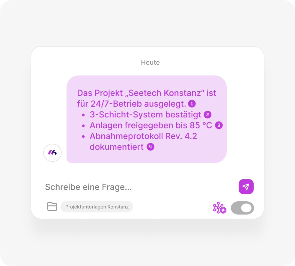 Stell dir eine Kollegin vor, die deine technischen Dokumente auswendig kennt und innerhalb von Sekunden präzise antwortet, inklusive Quellennachweis. Chatte mit MAIA über deine Dokumente und erhalte fundierte Antworten. Für effiziente und sorgfältige Projektarbeit in der Industrie.