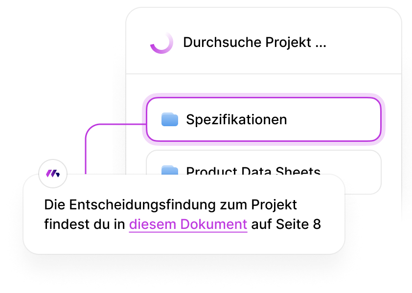 MAIA verknüpft alle relevanten Informationen im Projektkontext und stellt sie strukturiert zur Verfügung. Du erhältst sofort einen klaren Überblick über den aktuellen Projektstand und relevante Änderungen, verstehst wichtige Entscheidungen im Kontext, erkennst offene Punkte und To-Dos und siehst, wie Anforderungen, Angebote und Umsetzung zusammenhängen. Statt Informationen mühsam zusammenzutragen oder Experten einzubinden, erhältst du direkte, nachvollziehbare Antworten.